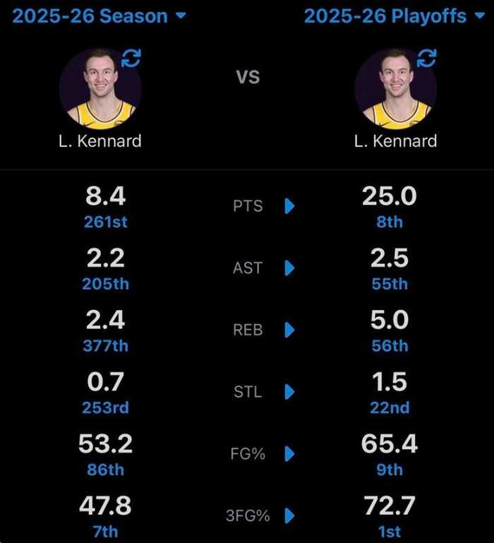 肯纳德本赛季常规赛场均8.4分2.3板2.2助 季后赛场均25分5板2.5助 发布时间:22/04/2026, 15:32:21 4月22日讯 NBA季后赛西部首轮G2,湖人101-94战胜火箭。 此役,肯纳德首发出战42分钟,投篮13中8,三分球6中3,罚球4中4,拿到23分6篮板2助攻3抢断。 在过去两战,肯纳德场均出战40.1分钟,砍下25分5篮板2.5助攻1.5抢断,投篮命中率65.4%,三分72.7%,罚球80%。 在常规赛中,肯纳德场均能得到8.4分2.3篮板2.2助攻。 标签: 178体育直播在线网